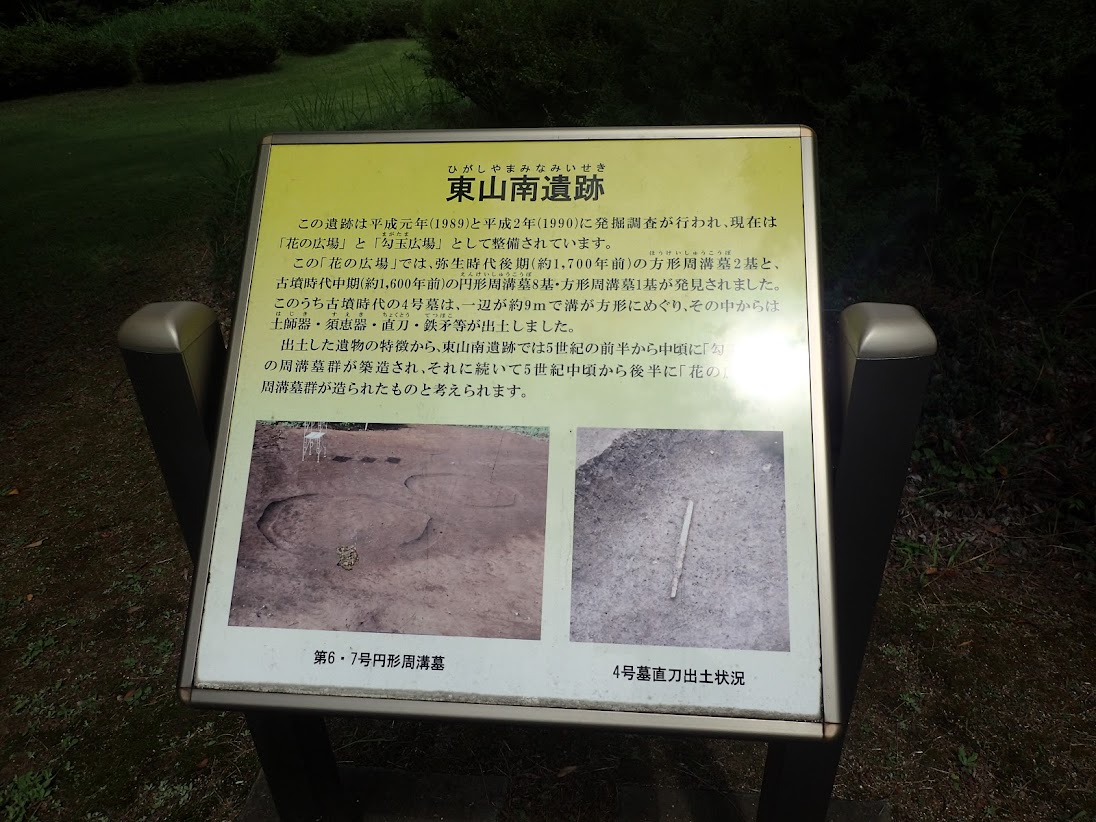東山古墳群と呼ばれるものがあり、主に大きな前方後円墳と円墳があります。