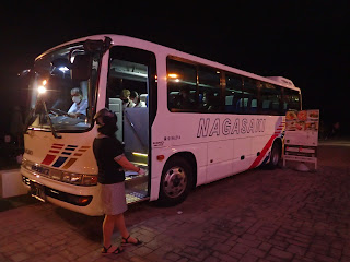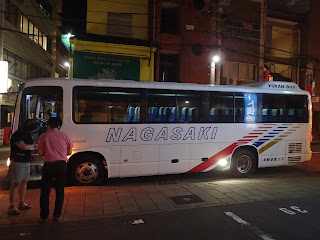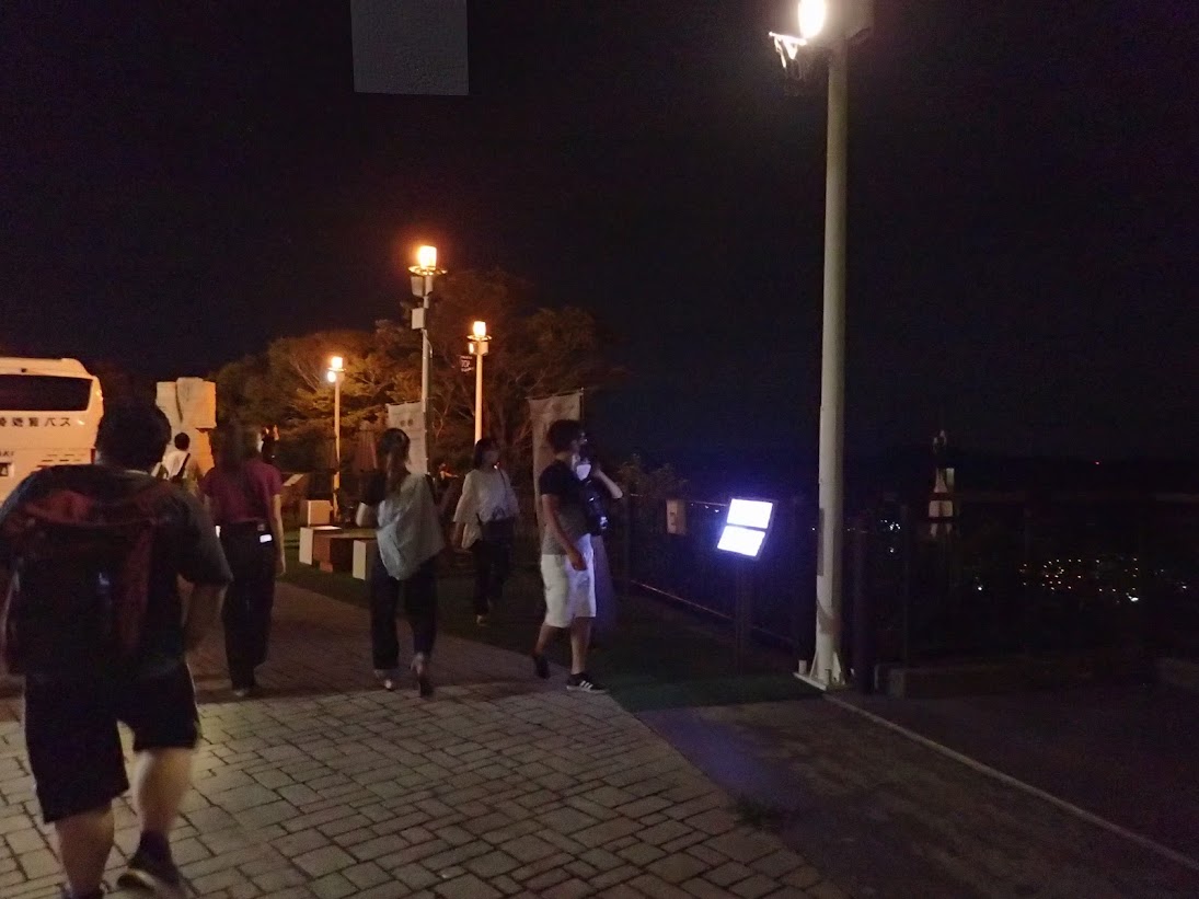夜、駅前の指定場所からバスに乗って稲佐山に向かいます。